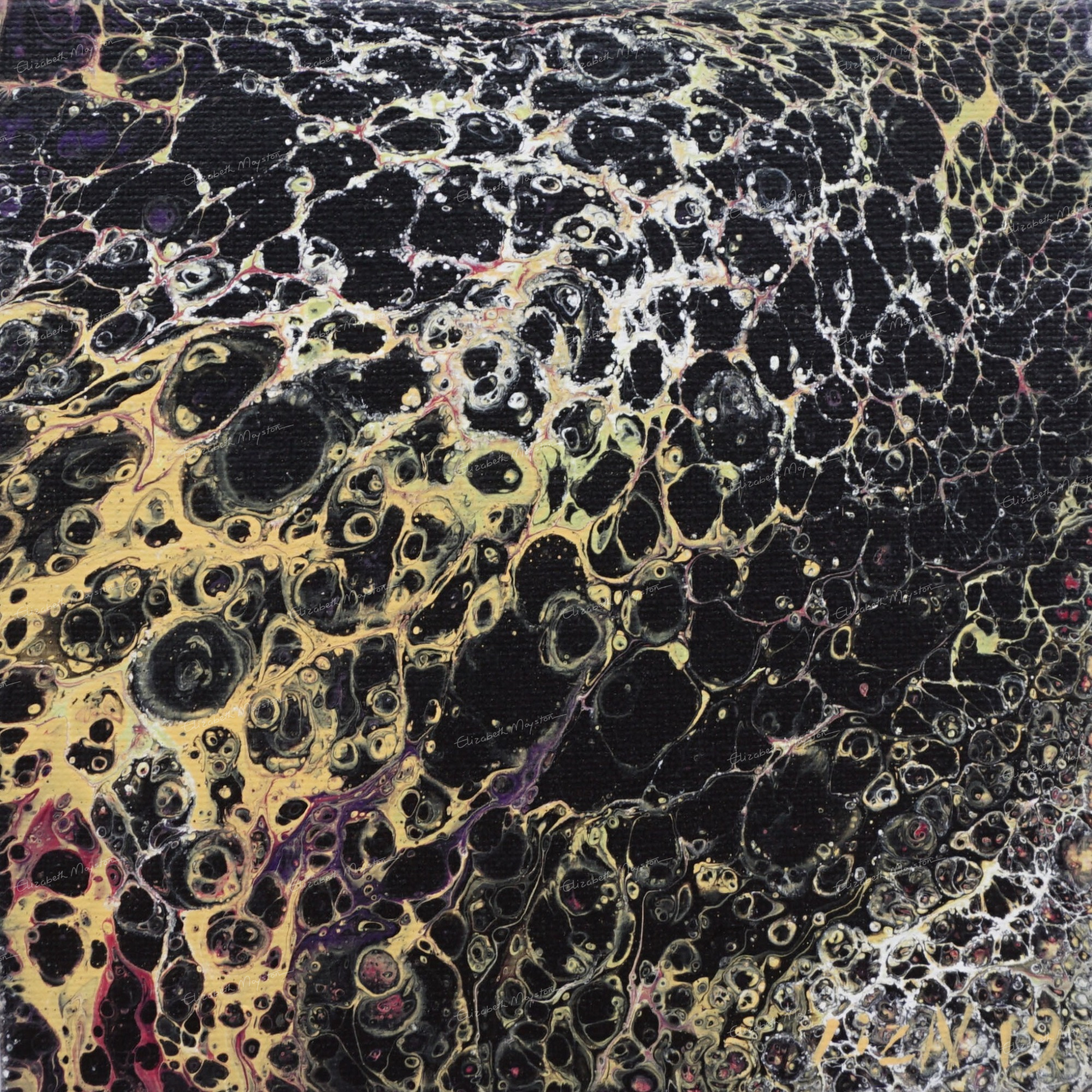 In this Algarve original art piece, I explored fluid dynamics to create a composition reminiscent of a cellular structure or topographic map. The painting features interconnected circles and organic shapes, with deep blacks and purples contrasting against vibrant yellows, subtle reds, and delicate white and gold lines that trace a network of connections.