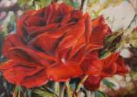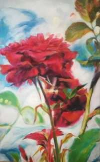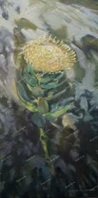As an artist painting in the Algarve, I am inspired by the interplay of light, shadow, and movement in nature. The green leaves of the flower are rendered with realistic detail, their edges gently blurred by the shifting reflections of water. The surface itself distorts and mirrors the image of the Protea, adding a dreamy, almost ethereal quality to the composition.