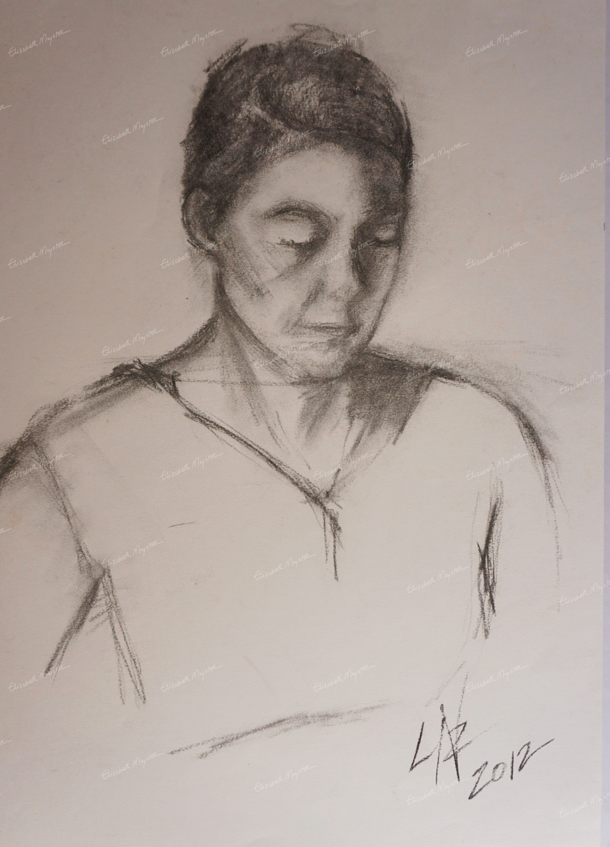 As an Algarve artist, my style leans toward impressionism, focusing on capturing the essence of the subject rather than detailed realism. In this Algarve original sketch, I depicted the person with their head turned slightly downward, evoking a thoughtful or introspective mood. The lighting is soft, with gentle shading that suggests the contours of the face and neck, bringing a quiet subtlety to the composition.