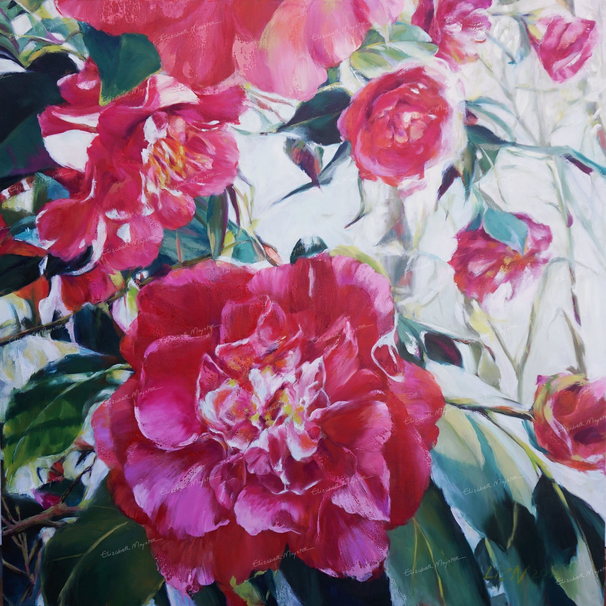In the background, I painted additional blooms and buds in softer focus, adding a sense of depth to the piece. The dark green leaves provide contrast to the brightly colored flowers, enhancing their vibrancy. The overall effect is one of lush beauty, reminiscent of a garden in full bloom. The interplay of color and form reflects my appreciation for fabric-like movement, texture, and design elements I carried over from my textile work into my painting.