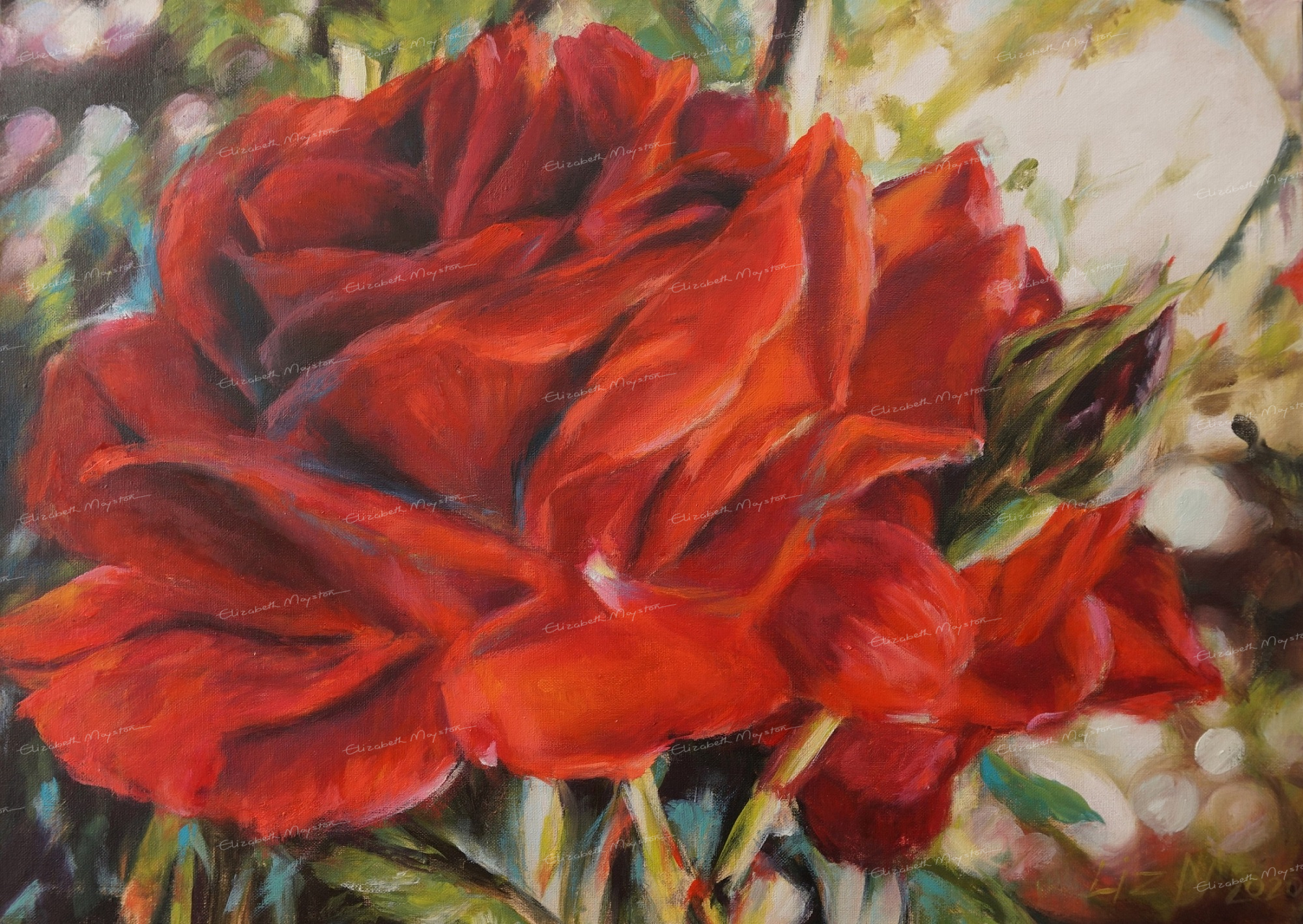 As an artist painting in the Algarve, I am constantly inspired by nature’s vibrant contrasts. The bold red of the rose stands out dramatically against the background, where blurred brushstrokes of greens and whites suggest light filtering through the foliage. This interplay of light and shadow creates a dynamic, dappled effect, bringing movement and energy to the composition.