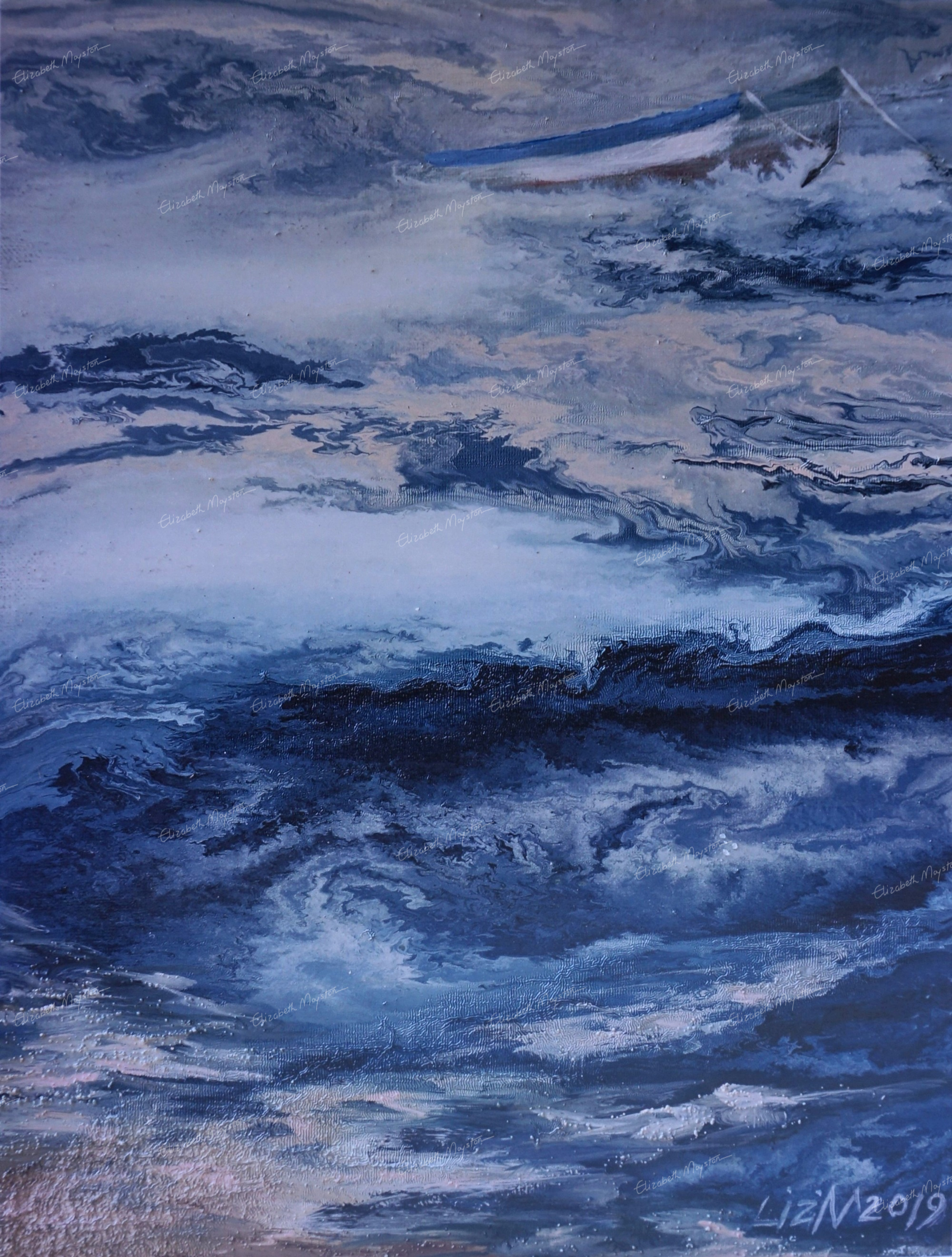 The blues and creams crash and swirl like a storm at sea, yet within the drama, there’s a quiet calm. A coolness. A rhythm. It reminds me of the feeling of riding a wave, trusting the motion without being consumed by it.