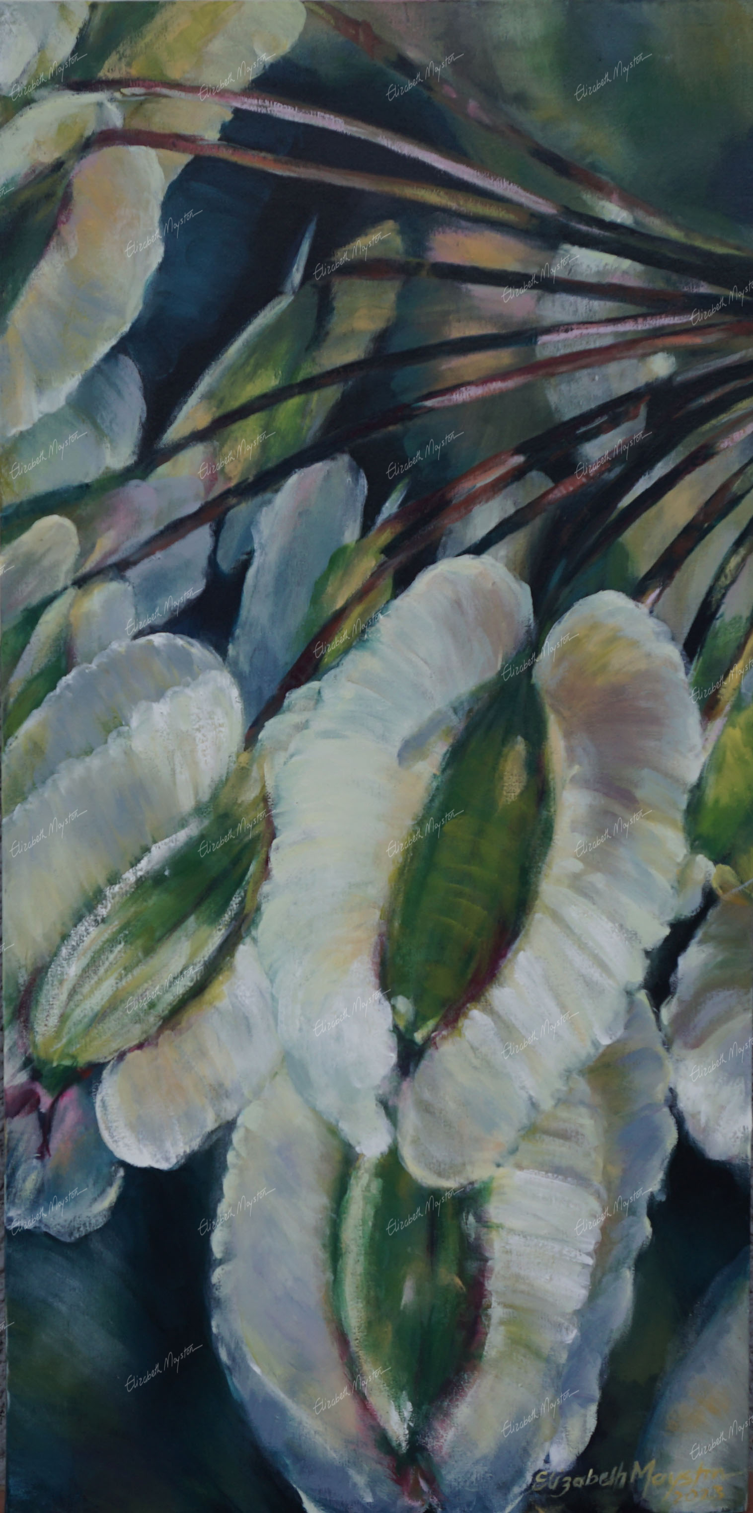 As an Algarve artist, I am constantly inspired by nature’s hidden details. Painting in the Algarve allows me to witness and capture the fleeting beauty of the region’s wild flora. Using loosely painted brushstrokes, I focused on the interplay of luminous color against a dark background rather than precise botanical detail. This approach allows the flowers to glow with an almost ethereal light, inviting the viewer to appreciate their subtle elegance.